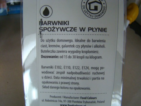 Dozowanie: 15-30 kropli na kilogram masy (dozowanie uzależniamy od intensywności barwy jaką chcemy uzyskać.