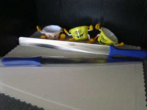 Nóż cukierniczy - o długości ostrza 31 cm ,wysokości 3,4 cm ma szczególne zastosowanie w krojeniu tzw, rantów tortowych -biszkoptów na plastry w celu nasączania ponczem i nakładania kremu,nadzienia lub stabilizowanej bitej śmietany.Jednostronnie tępy grzbiet.Często używany łopatka do rozprowadzania kremu.(zależy od "szkoły" rozprowadzania i wyrobienia nadgarstka.)