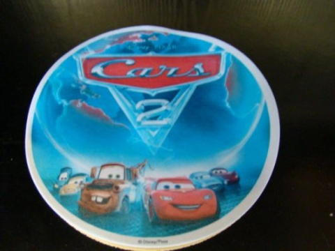 Cars II dysk waflowy z nadrukiem o średnicy 20 cm do dekoracji tortów.Należy Pamiętać o lekkim zwilżeniu woda spodniej płaszczyzny opłatka i po położeniu go na tort żelowaniu - cieniutka warstwą.
