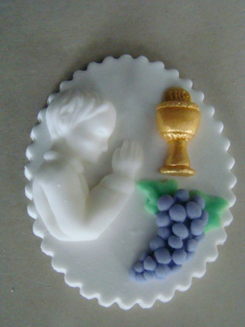 Tabliczka komunijna z cukru z wizerunkiem dziecka ;złotego kielicha z Hostią oraz kiścią winogrona z zielonym listkiem Wielkość dekoracji 11 cm